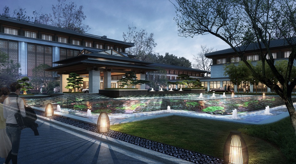 泰州东湖宾馆位于泰州市新城核心位置,是泰州接待国际级领导人的迎宾馆。设计紧跟泰州市整体城市风貌,兼融吴楚越之韵,汇聚江淮海之风。着力打造与主体建筑相融合具有特色的现代中式园林景观。设计理念:传承悠长岁月的美学理念,演绎艺术花园的古朴精致。设计以清末的著名画家任熊所创作的《十万图册》作为设计灵感,这十幅以描绘祖国富饶山河的唯美画卷,随着《十万图册》的内容展开,栩栩如生的引入眼帘。设计将《十万图册》中的画作与场地相互联系,赋予场地各景点新的意义,根据不同的景色和场所需要,打造别具一格的精致新中式景观,打造具有泰州特色的新十景。